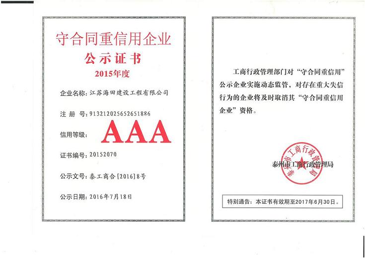 熱烈祝賀我公司評為2015年度“守合同,重信用”企業(yè)